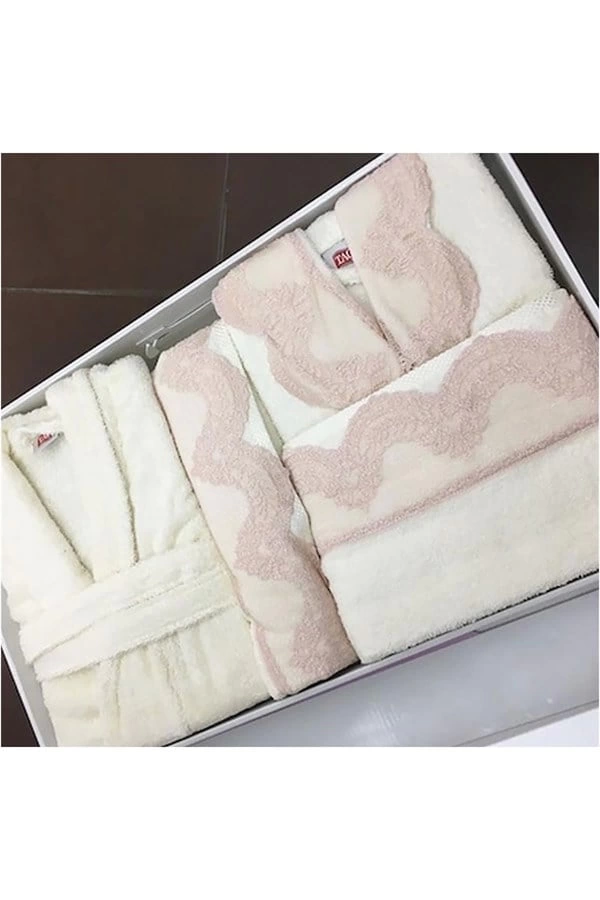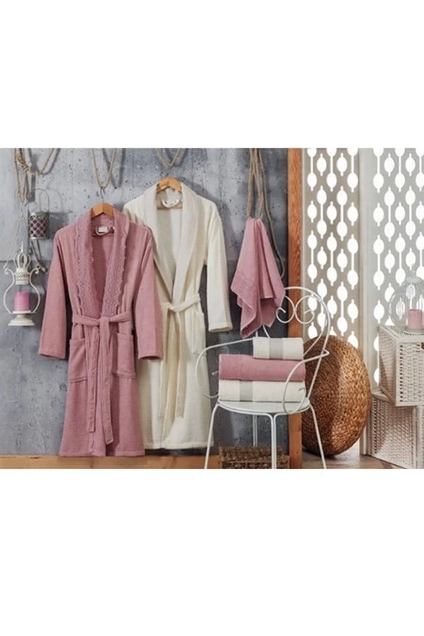 Taç Alcanlar Dantel Desenli Aile Boyu Bornoz Seti Lila ve Gri Renk