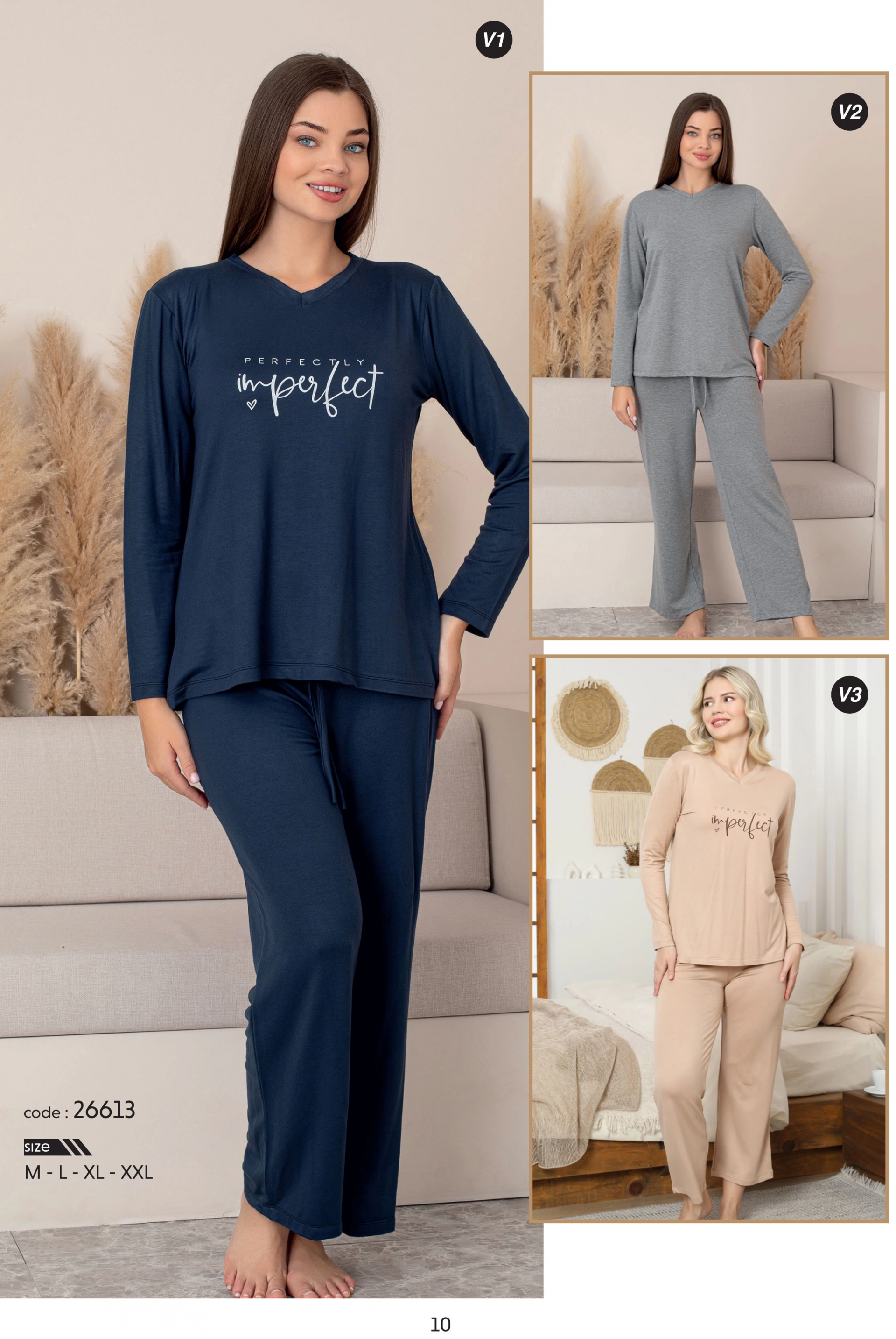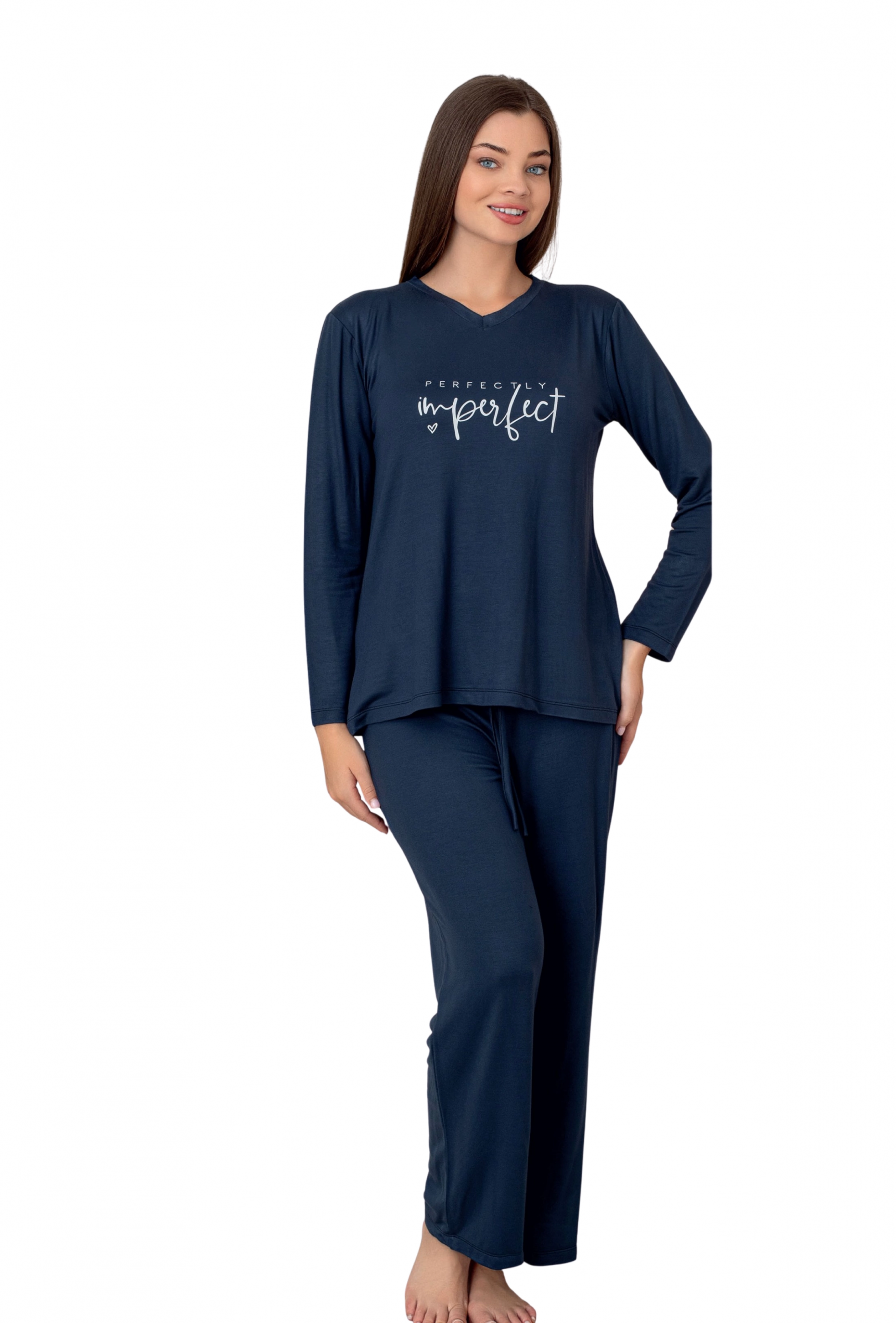 Limissi Lacivert Uzun Kollu Kadın Pijamaı 26613, rahatlığı ve şıklığı bir arada sunar. Hem günlük kullanıma uygun hem de gece giymek için ideal bir seçenektir.